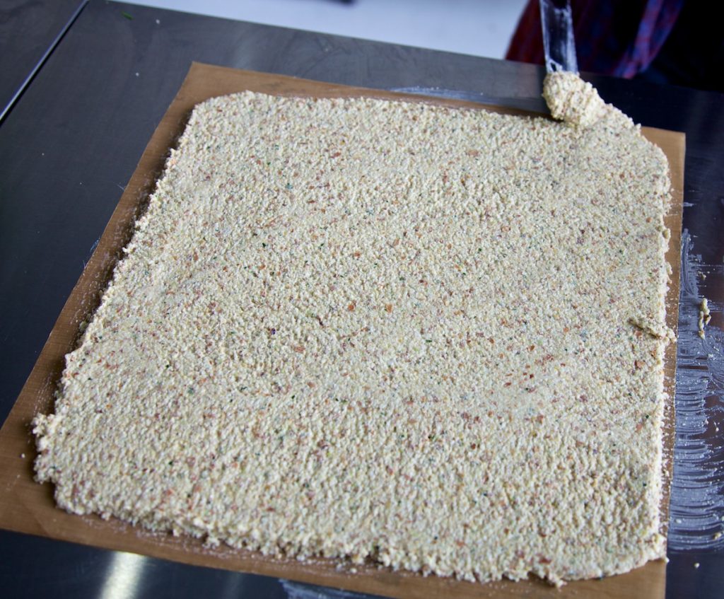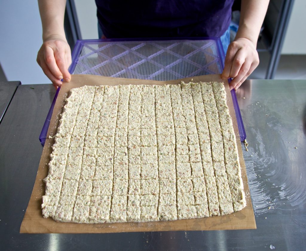 - Spread this mixture evenly into a square on the sheet. You’re going to dehydrate this as it is, for 4 hours at 115 degrees F, until you can invert the whole thing on to another dehydrator tray without the non-stick sheet. In this process you’ll also want to take a sharp knife and score the large square into lots of smaller squares, which will be the size of the final croutons. I like about 3cm squares - about an inch - and pop back into the dehydrator for a further 12 hours or so.