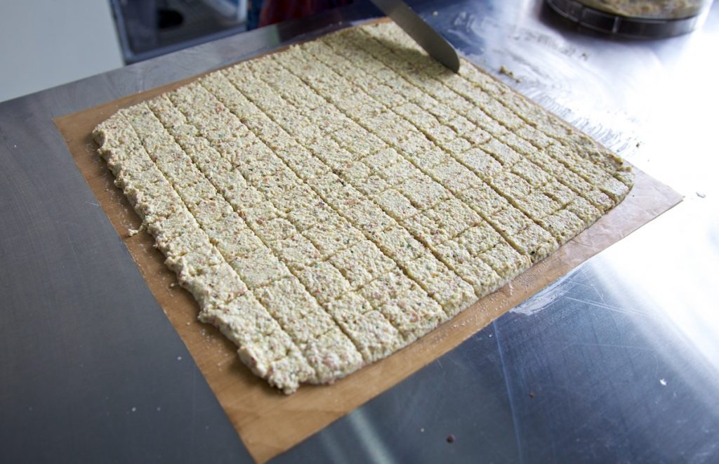 - Next you’re going to empty the contents of the food processor on to a nonstick sheet, spread it out evenly and then score into squares.