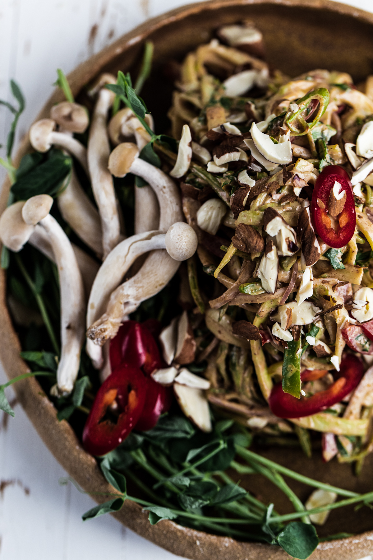 Traditionally Pad Thai sauce is made of tamarind, sugar, fish sauce and garlic. For this raw version we’re using dates, garlic and tamari as the main flavour elements. The nut or seed butter also gives this version a richness that goes well with any of the noodle options.